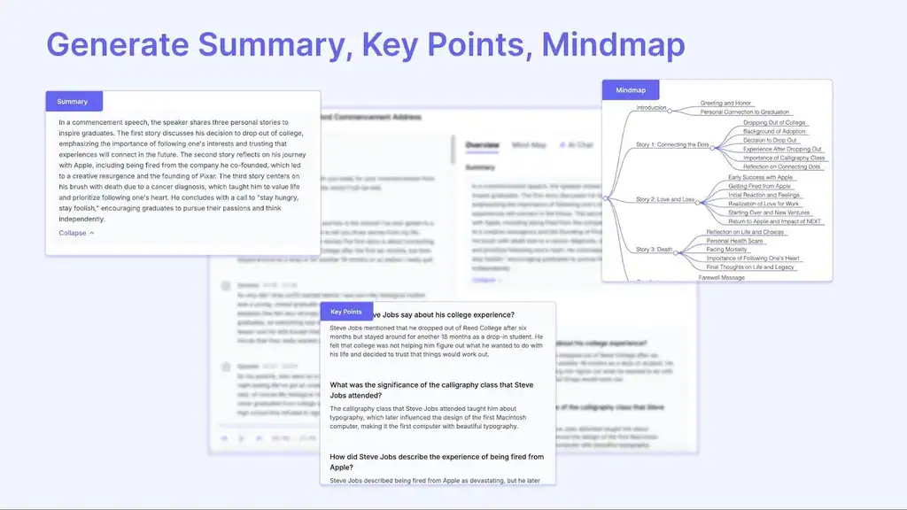 • Generates summaries and key points in a Q&A format