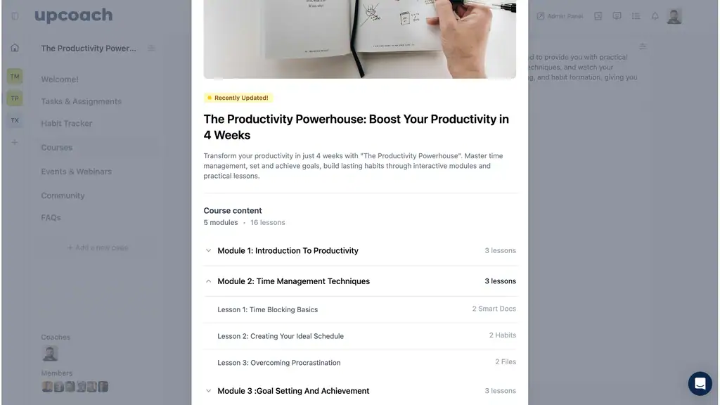 Upcoach is a platform that helps you build coaching programs and courses that keep clients accountable and foster community.