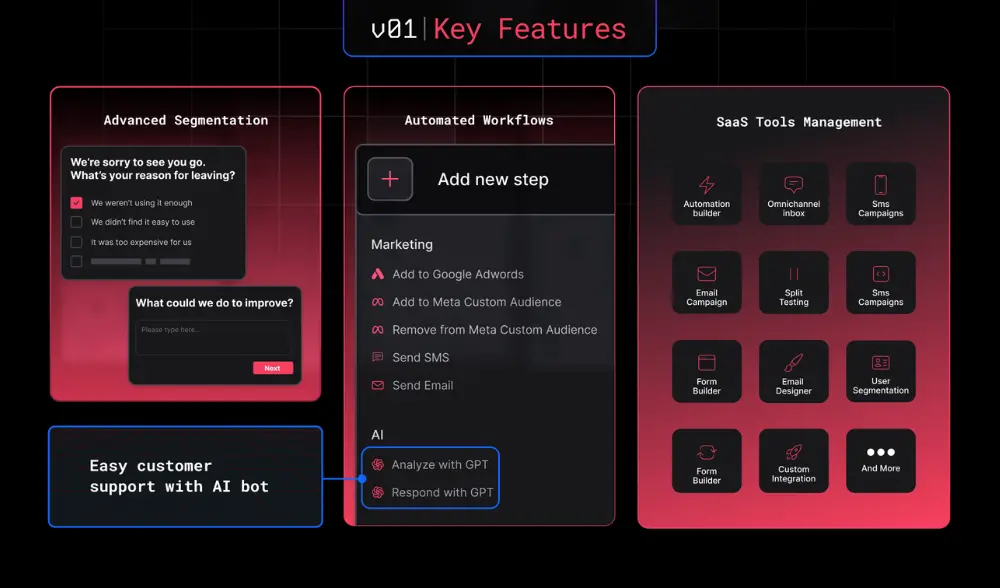v01 streamlines your operations by automating important tasks, boosting growth, and helping you take advantage of every step of the customer journey.