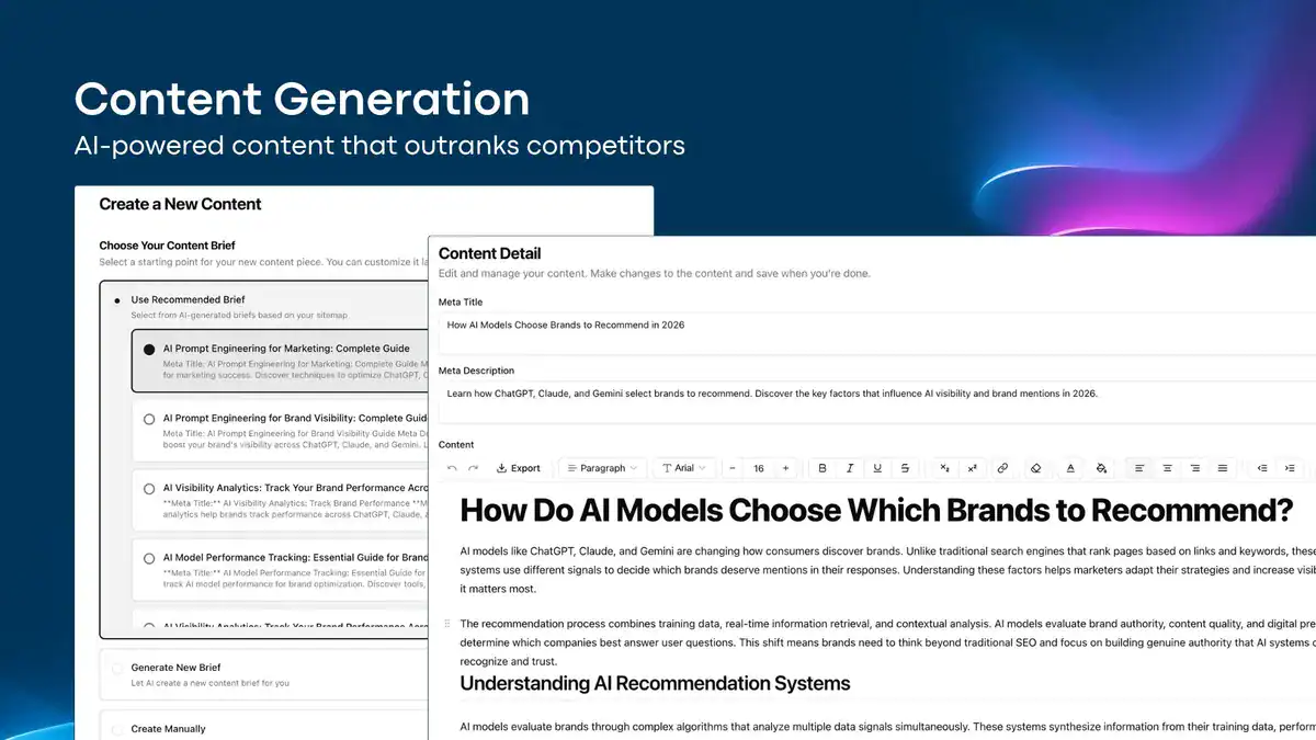 - Generate AI-optimized content briefs based on your visibility data and performance gaps