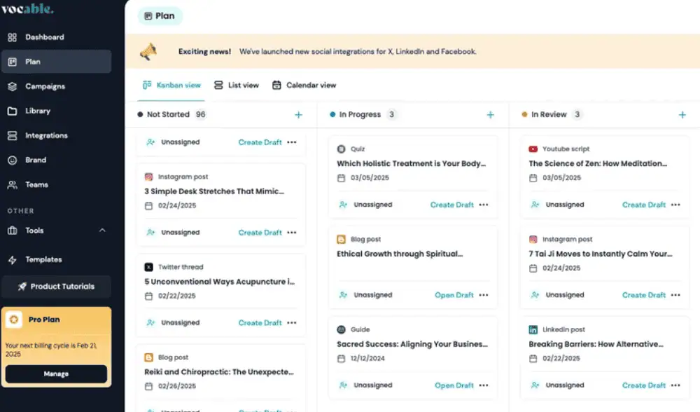- Organize your content pipeline with options for list, kanban, and calendar views