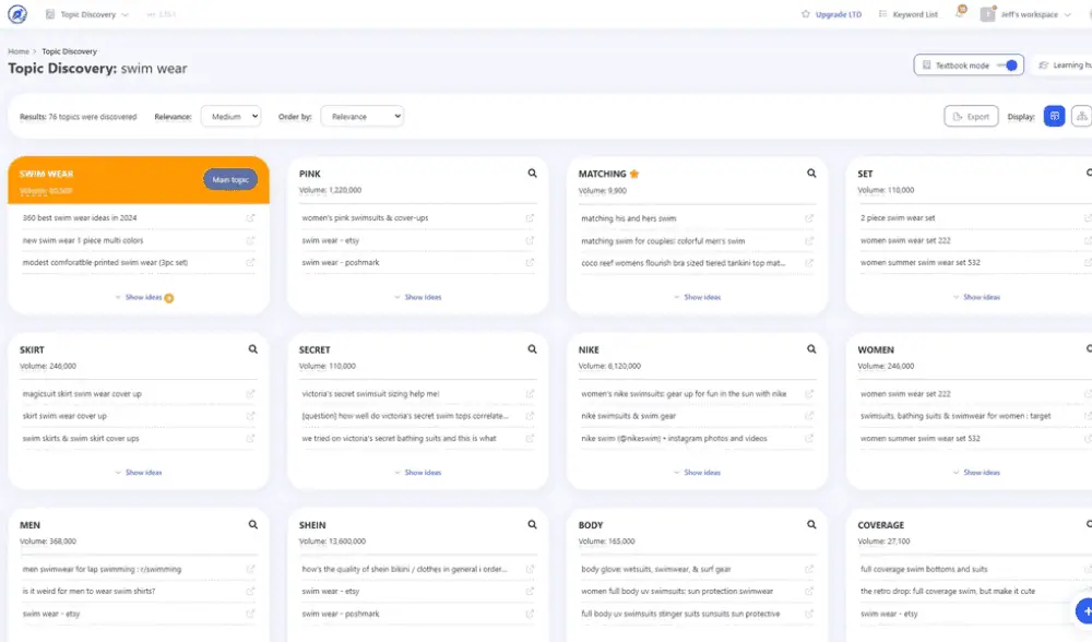 The topic discovery tool lets you find strategic topics with low competition and high relevancy, so you can build topic clusters that fill the gaps in your knowledge base.