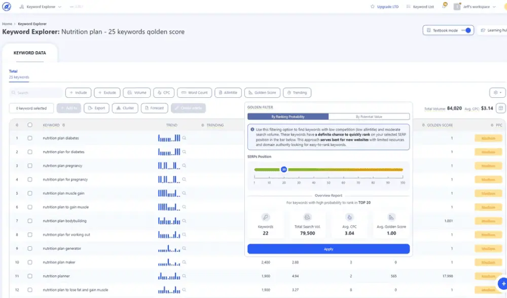 After you’ve chosen a topic, WriterZen will guide you through the next step in your SEO workflow to help you find relevant keywords that fit your content ideas.