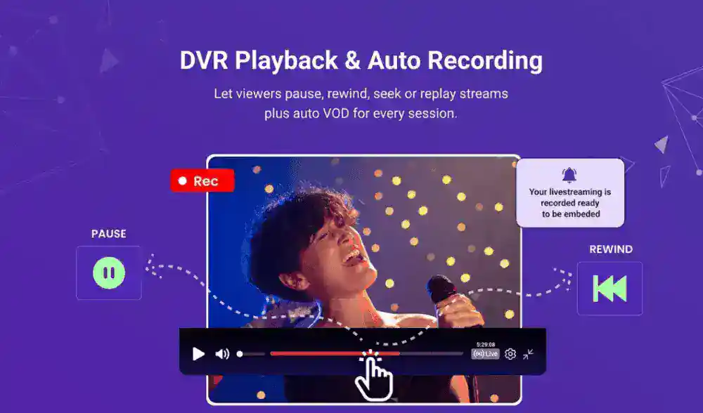 • Let your audience play, pause, and rewind for up to six hours back
